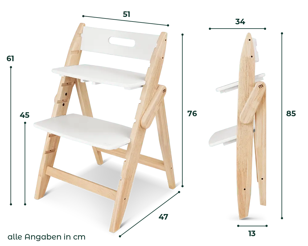 Hochstuhl: Holz vom Kautschukbaum aus nachhaltigem Plantagenanbau (dank harter Oberfläche sehr kratzfest und pflegeleicht)